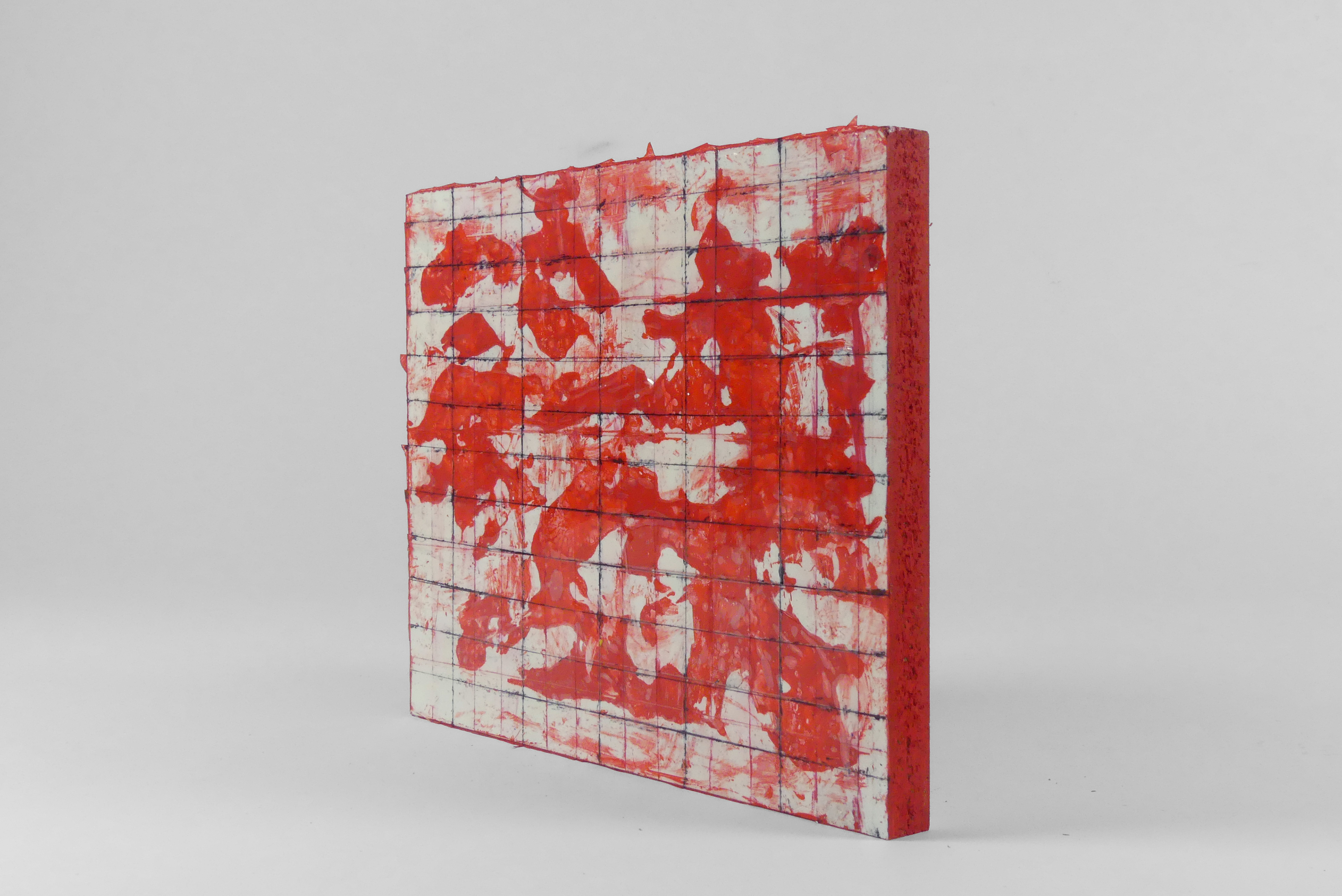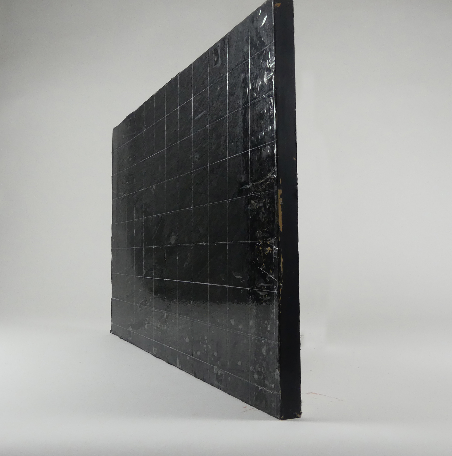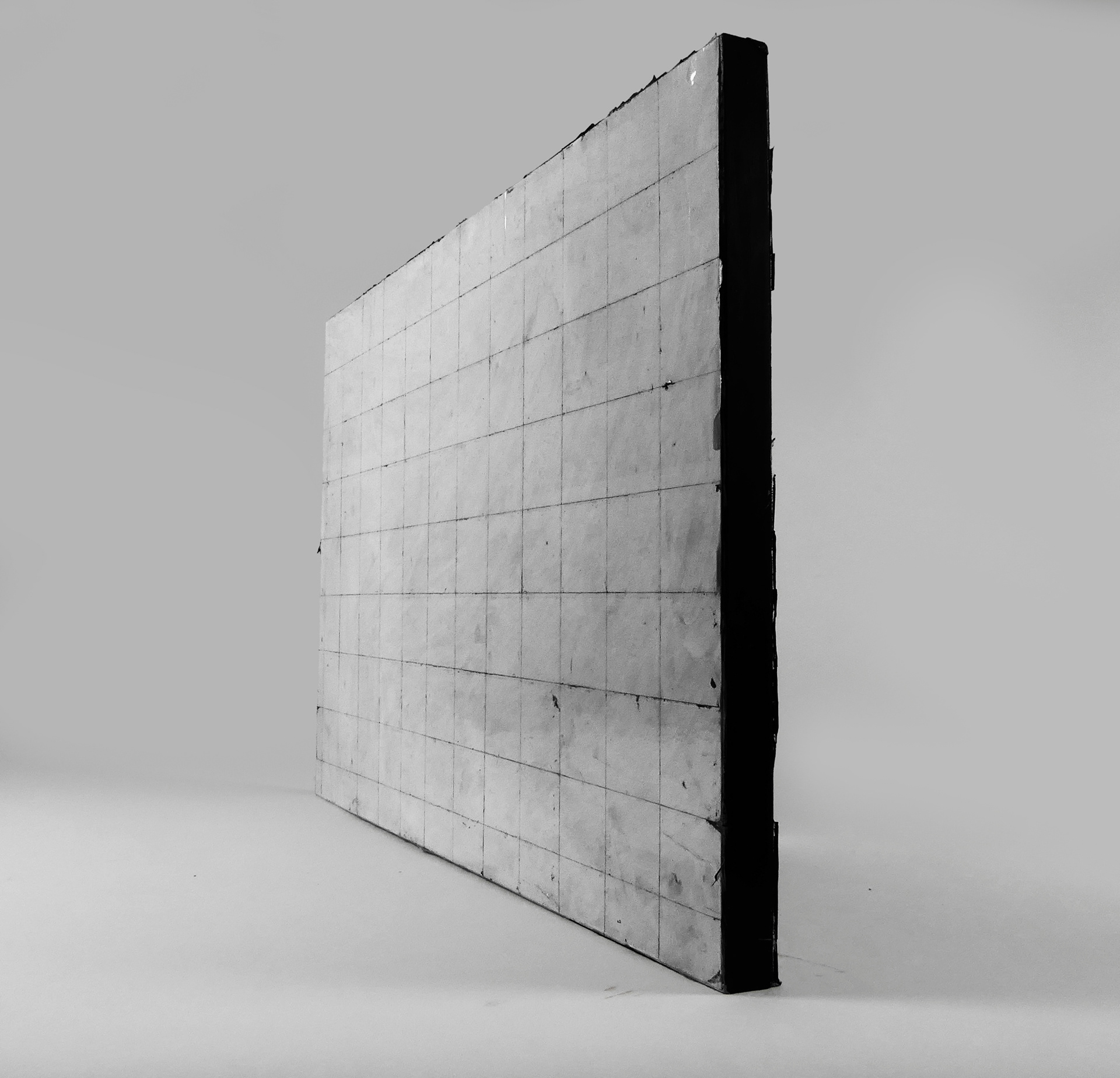 Ces tableaux-sculptures, présentés debout avec leur double face, présente un quadrillage créé par la friction entre les bords du scotch et le posca. A travers eux, j'explore un côté sensible de la géométrie en sortant de la froideur du trait mathématique pour aller vers l'importance du geste et de la trace humaine.