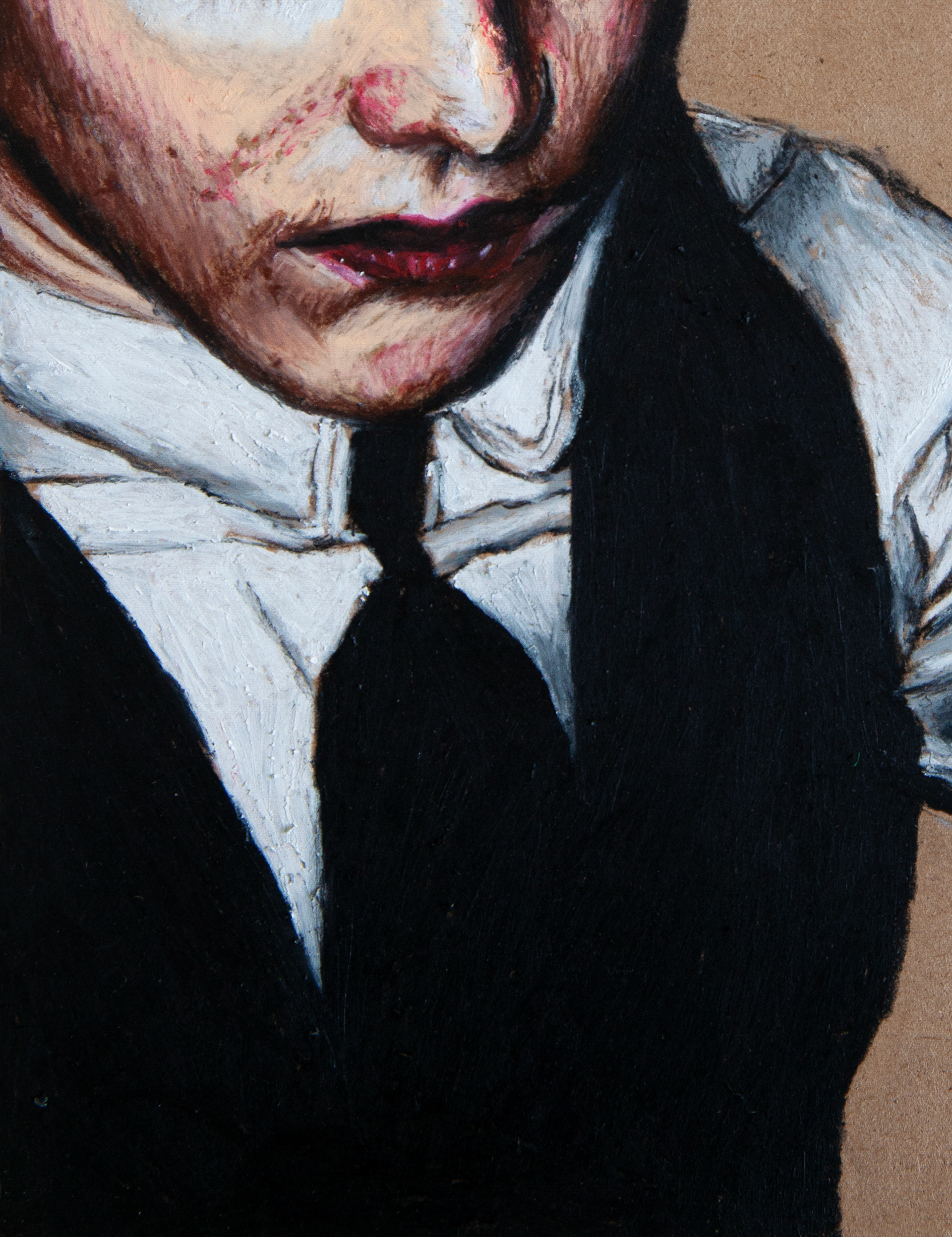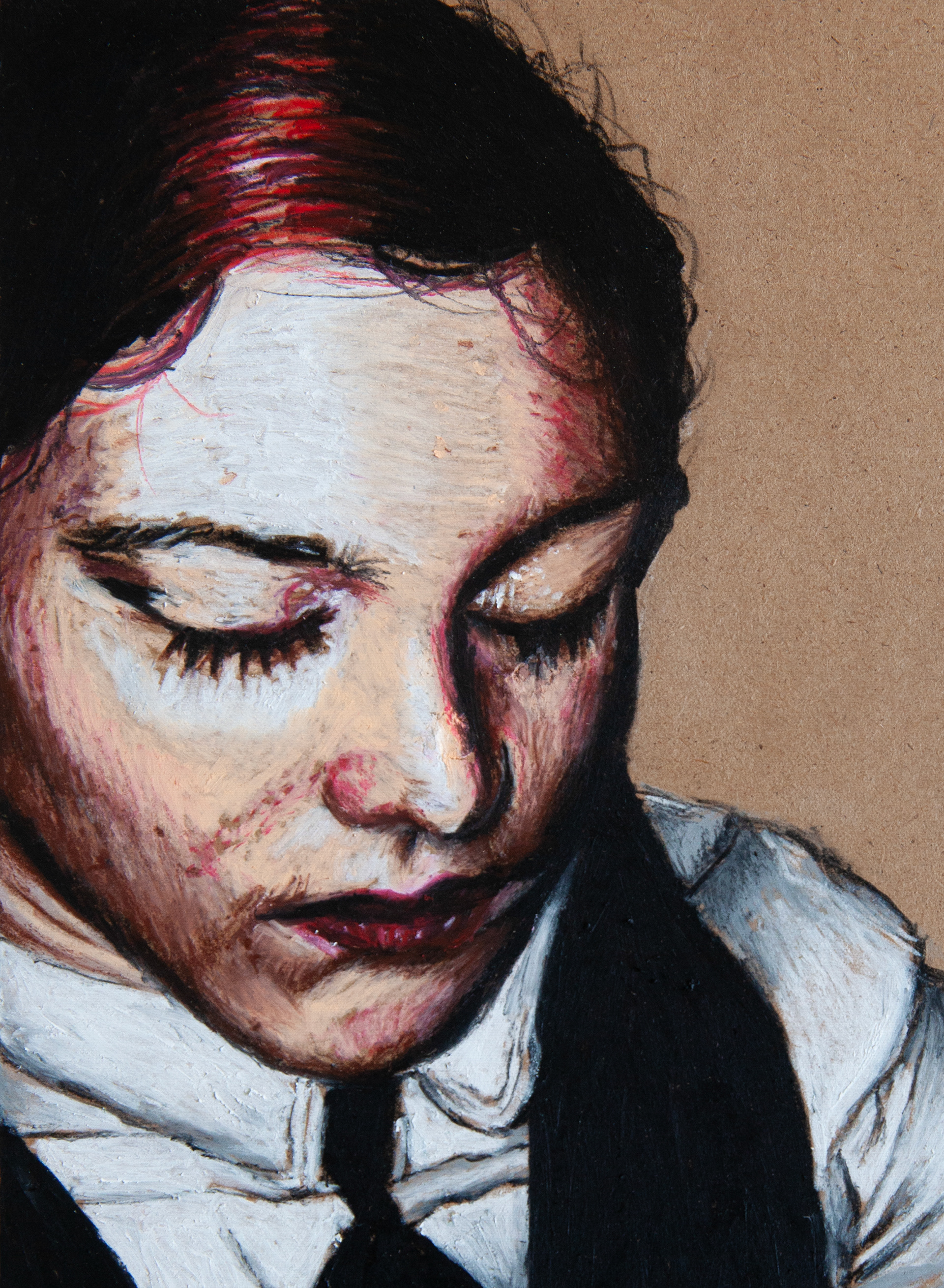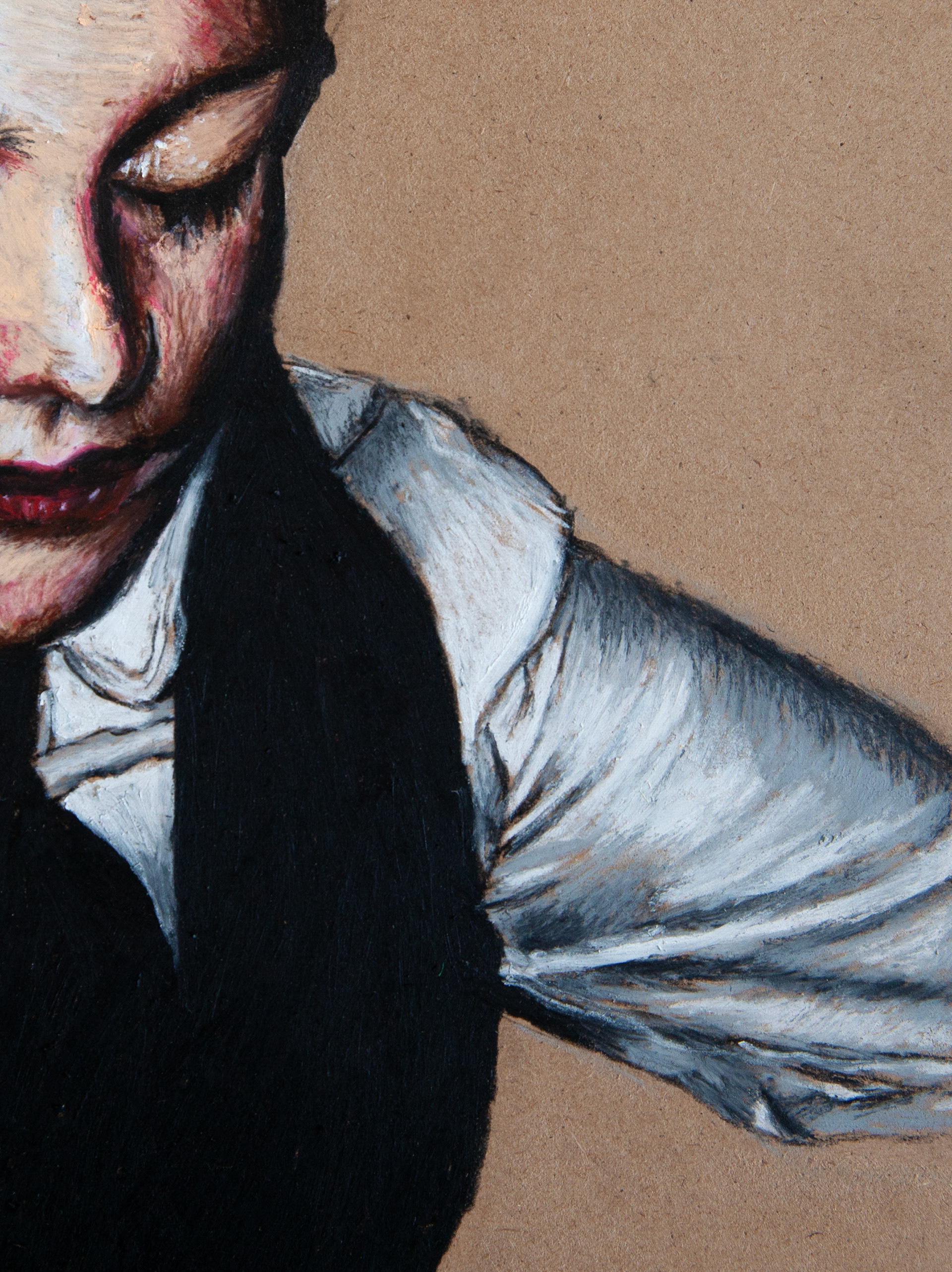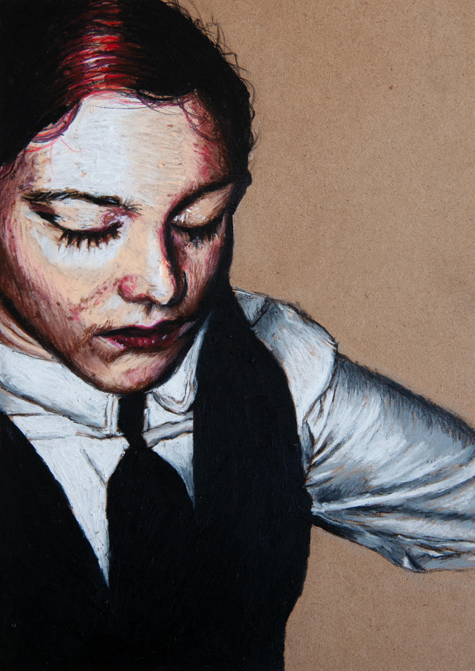 La seule photo qui me plaisait pour me représenter était une où je fermais les yeux. Le derrière du pastel montre un collage des mouchoirs qui m'ont servi à me démaquiller.